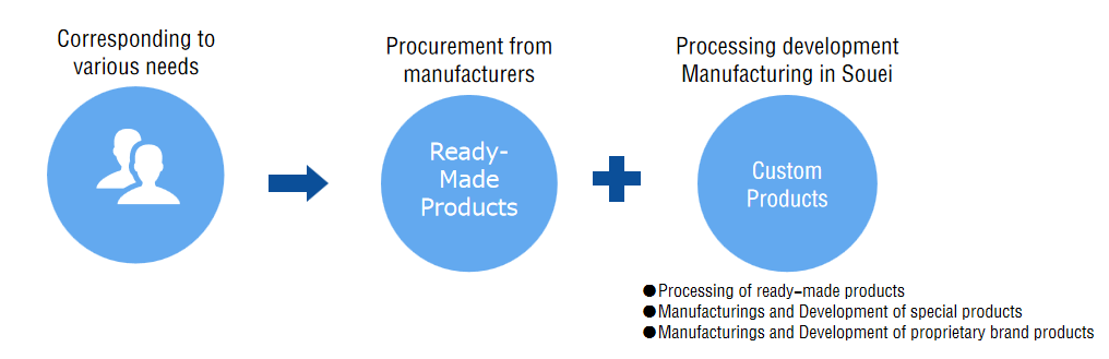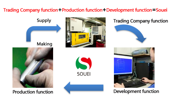 Souei has the development function to produce products that are not yet i•n the world together with the know-how of manufacturδing and the information obtained from the trading company function.